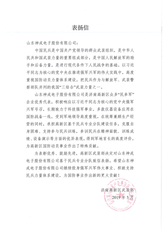 神戎電子獲得濟(jì)南高新區(qū)武裝部致信表?yè)P(yáng)